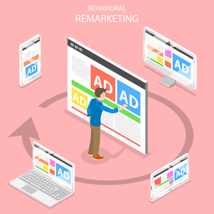 Remarketing flat isometric vector concept. A man pushing an AD on the web page and gets the same advertising banner on all types of devices for internet access.