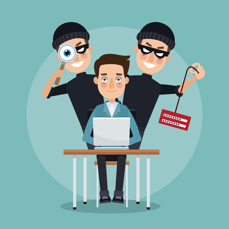 scene color programmer man in desk with laptop and pair thief men hacker stealing information and spying vector illustration