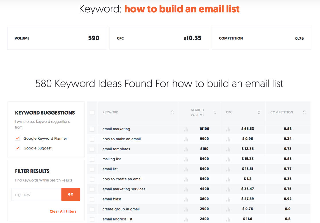 After submitting your keyword or search phrase, Ubersuggest will then spit out a ton of data for you to start looking through immediately. This information is actually pulled right from Google and their Keyword Planner tool and Google Suggest.